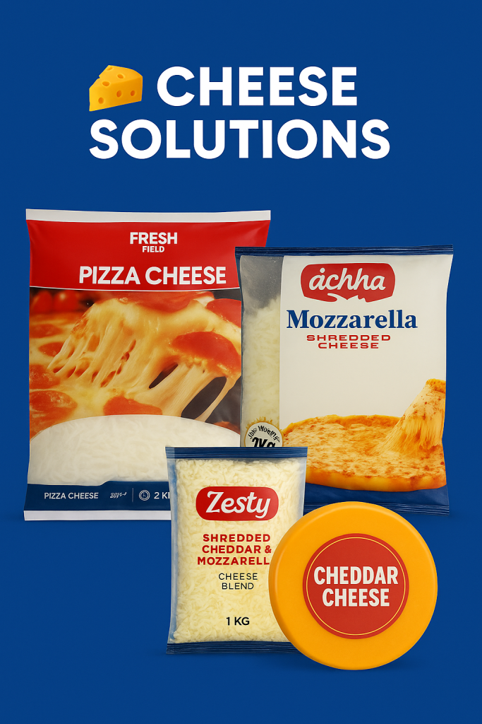 Mozzarella, shredded cheese, and pizza cheese blends.